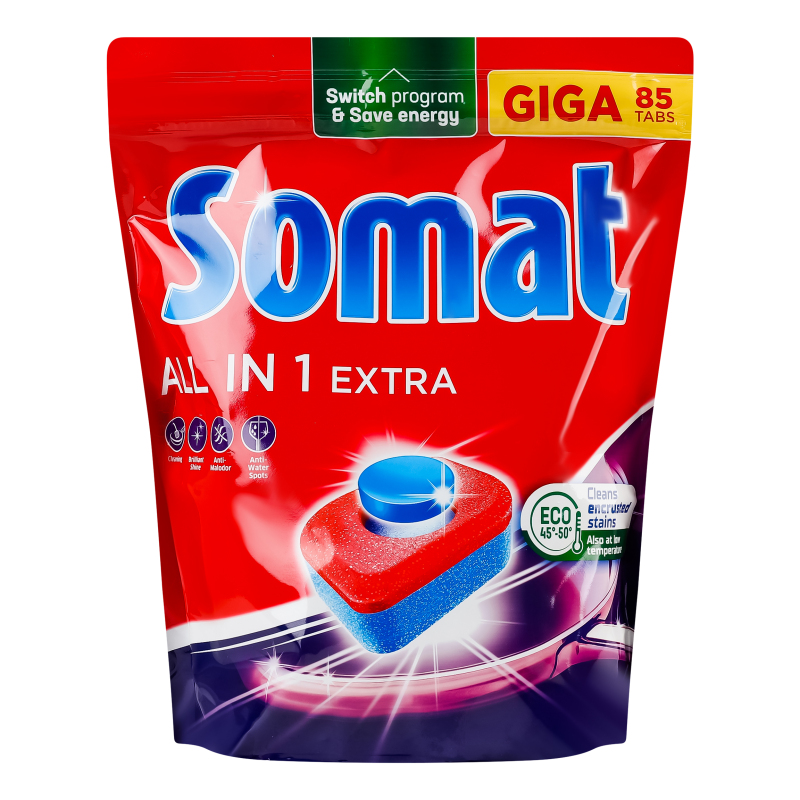 „Somat All in 1 Extra“ – tai aukštos kokybės indaplovių tabletės, sukurtos užtikrinti nepriekaištingą indų švarą net ir esant sudėtingiems nešvarumams. Speciali „viskas viename“ formulė veiksmingai pašalina pridžiūvusius riebalus, maisto likučius ir dėmes, suteikia blizgesį bei apsaugo indaplovę nuo kalkių.